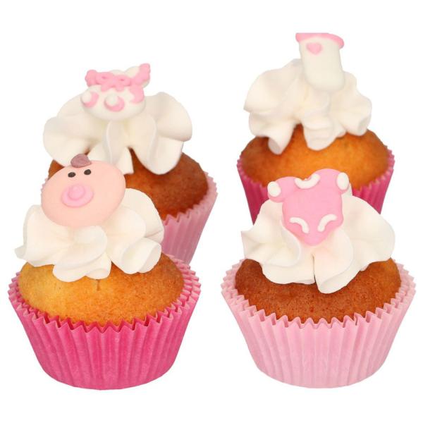 Sockerdekorationer Rosa Baby innehåller 8 stycken ätbara baby tårtdekorationer.