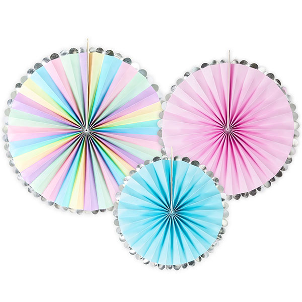 Solfjäder Dekorationer Mångfärgade består av 3 stycken solfjädrar, en i blått, en i rosa och en mångfärgad i pastellfärgerna : gult, lila, grönt, blått och rosa. Alla tre är i olika storlekar och kantas av en silvrig metallic färg. Alla dekorationer är hängande och kommer med en praktisk ögla som gör att det blir lätt att hänga upp dom.