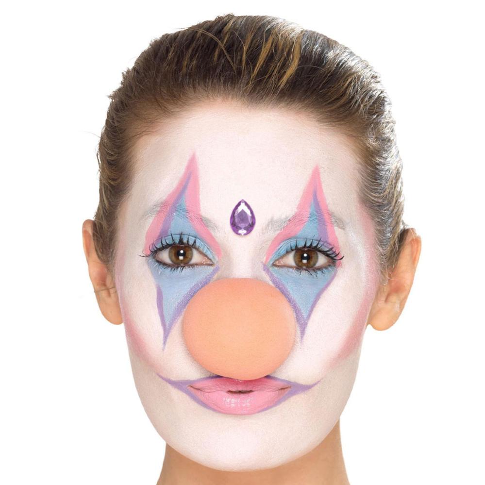 Söt Clown Smink Kit omfattar ett clownsmink kit med ansiktsfärger, glitter, en clownnäsa, en ädelsten och en sminksvamp samt en sminkborste. Sminket är enkelt att applicera och passar vuxna.