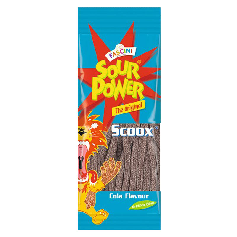 Sour Power Godisremmar Cola bestå av en påse med godisremmar och har smak av sur cola.