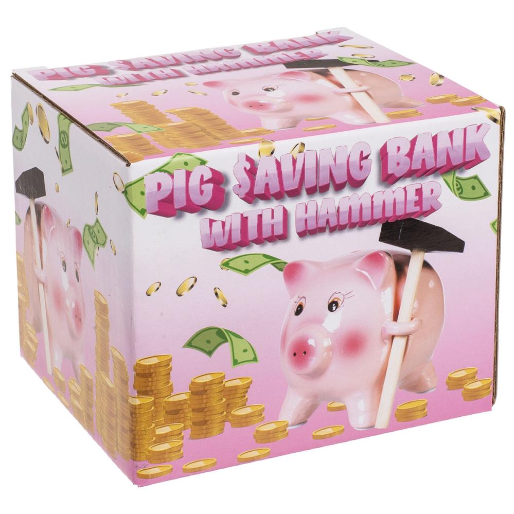 Spargris med Hammare 13 x 10,5 cm omfattar en sparbössa i form av en rosa gris som håller i en avtagbar hammare i svart och brunt. För att få ut pengarna måste sparbössan slås sönder med hammaren, då den saknar öppning undertill.