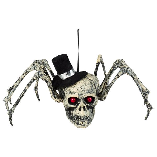 Spindel Dödskalle Dekoration innehåller en vit och svart spindel döskalle med långa ben, röda ögon och en svart hatt. Spindeln är tillverkad av plast och är ca 23 x 12 cm stor. Dekorationen har även ett snöre upp till för upphängning.