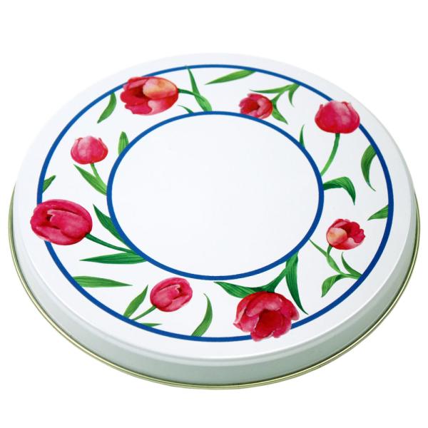 Spislock Tulpaner 4-pack består av fyra lackerade spislock i tre olika storlekar. Varje spislock är dekorerat med rosa tulpaner och gröna blad, samt två blåa cirkulära linjer mot en vit bakgrund.
