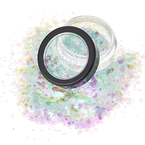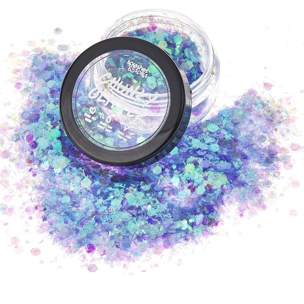 Om du vill ha glitter som får dig att skimra som inget annat till ditt smink så är det svårt att slå Splashes and Spills Iridescent Chunky Glitter. Med stora regnbågsskimrande glitterbitar i flera snygga nyanser kan du verkligen skapa en unik glittersminkning. Perfekt smink att glittra med som älva, sjöjungfru, enhörning eller annat sagoväsen på Halloween maskeraden eller kalaset.