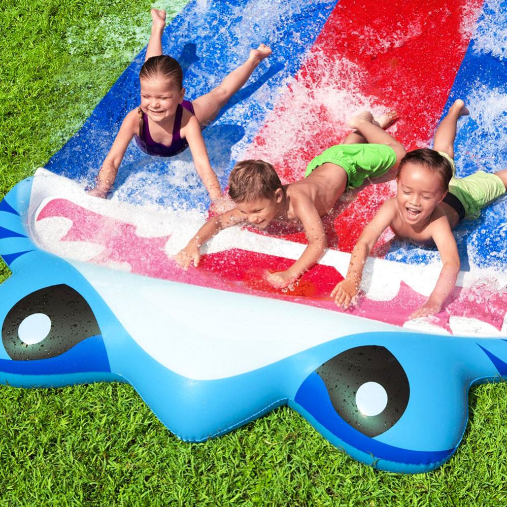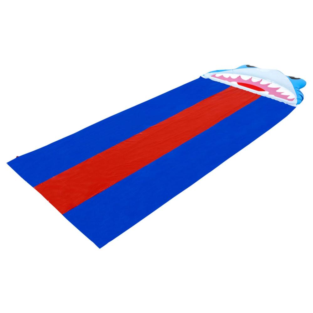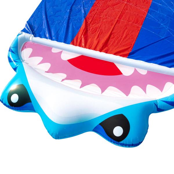 Splashy Shark Vattenglidbana omfattar en vattenglidbana med häftig haj-design för barn från 3 år och uppåt. Vattenglidbanan har inbyggda vattenspridare för kaskadeffekt som håller banorna hala samt en splashpool i slutet som ger ett stort plask. Glidbanan är tillverkad av PVC-plast och är ca 488 cm lång och 200 cm bred. Ansluts till en trädgårdsslang.