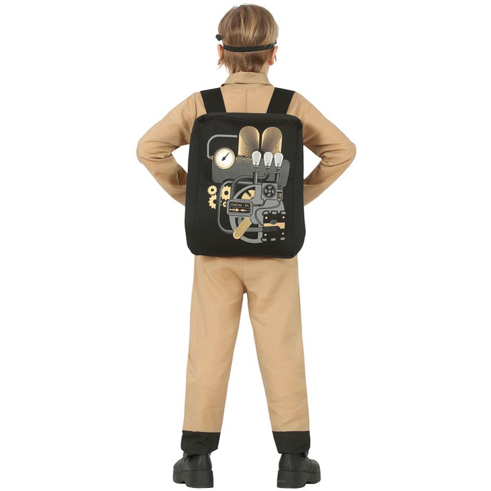 Spökjägare Maskeraddräkt Barn omfattar en spökjägare barndräkt med en beige jumpsuit och en svart ryggsäck med tryck.