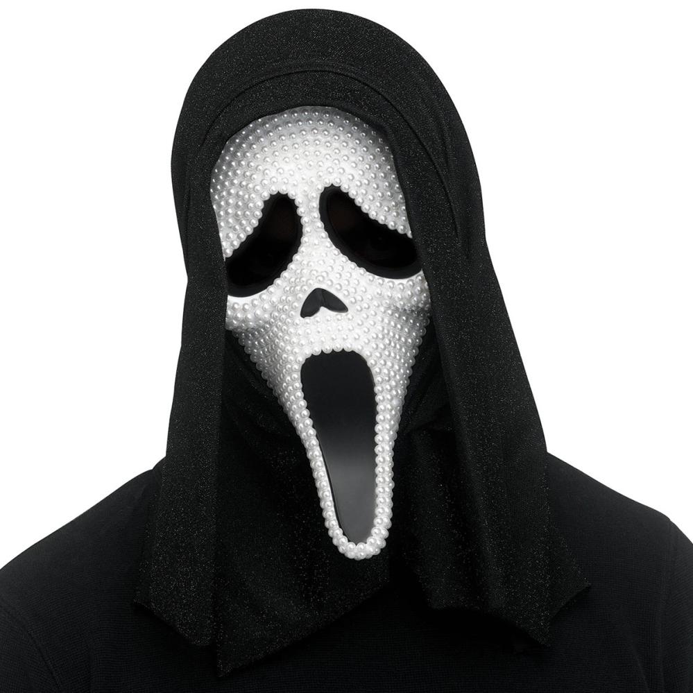 Spökmask med Pärlor är en heltäckande spökmask med motiv av spöket från "Scream". Masken är dekorerad med vita pärlor och har en svart glittrande tygbaksida, hål för ögonen och munnen, en mjuk skumkudde vid pannan samt ett svart elastiskt band som håller den på plats.