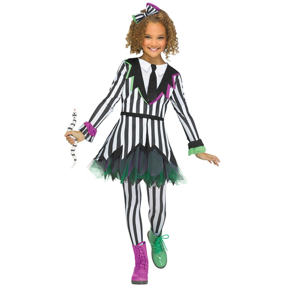 Spralligt Spöke Maskeraddräkt Barn omfattar en dräkt inspirerad av den ikoniska karaktären Beetlejuice. Dräkten består av en svart- och vitrandig kavajklänning med spetsiga detaljer, neongröna och lila accenter samt ett transparent lager av spindelvävsliknande tyll längs kjolens nederkant. Ingår gör även ett par matchande randiga fotlösa tights, ett diadem med rosett och en avtagbar svart slips.