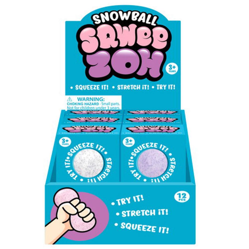 Squeeze Snöboll Stressboll omfattar en stretchig stressboll som är fylld med vitt mjöl som ger en speciell känsla när den kläms. Bollen är transparent med små prickar i färgerna lila, blå, guld eller silver, vilken du får blir en överraskning.