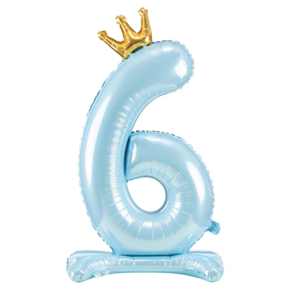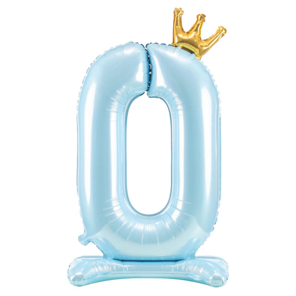 Stående Sifferballong med Krona Blå omfattar en stående sifferballong i ljusblått med en liten guldig krona på toppen. Ballongen är i folie, är ca 84 cm hög och har självförslutande ventil. Fylls med luft. Välj mellan siffrorna 0-9.