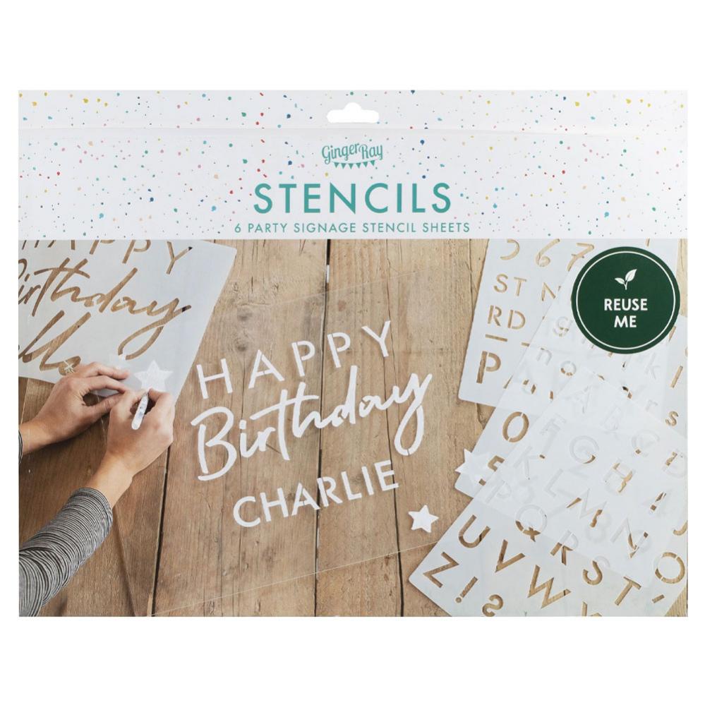 Vill du skapa din egen välkomstskylt till nästa födelsedagsfest så är dessa stenciler ett perfekt tillbehör för dig! Med dessa stenciler kan du nämligen få till riktigt proffsiga texter som garanterat får din välkomstskylt att se riktigt bra ut. I detta kit får du hela 6 st olika stenciler med olika bokstäver, siffror, tecken och ord som kan kombineras på flera olika sätt, perfekt till varje firande. Stencilerna är även återanvändbara vilket passar toppenbra för dig som vill fira alla födelsedagar med stil!