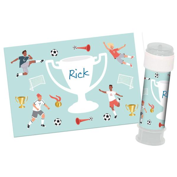 Stickers till Såpbubblor Fotbollskalas 6-pack består av sex omslag till små såpbubbelflaskor, prydda med ett färgglatt fotbollsmotiv och med utrymme på den vita pokalen för att skriva en personlig hälsning eller ett namn.