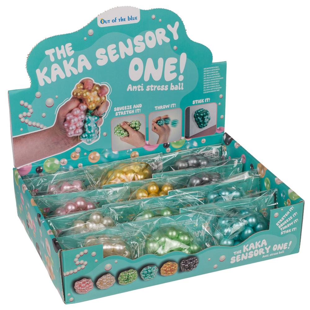 Sticky Squishy Stressboll med Pärlor består av en klämboll fylld med stora, mjuka pärlor som ger den en unik textur och en extra sensorisk upplevelse vid knådning. Bollen har även en klibbig yta, och när den kastas mot en slät yta fastnar den och glider långsamt ned. Den finns i sex olika färger.
