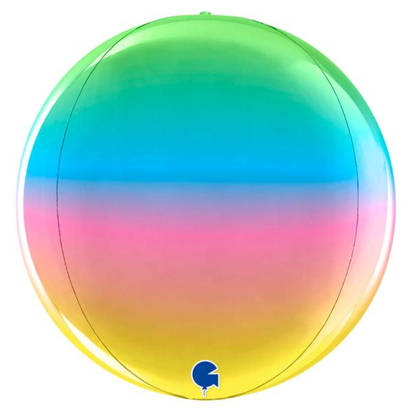 Stor Globe Folieballong Rainbow omfattar en klotrund folieballong i regnbågsfärger. Ballongen är självförslutande, fylls med luft eller helium och mäter ca 38 cm i diameter uppblåst.