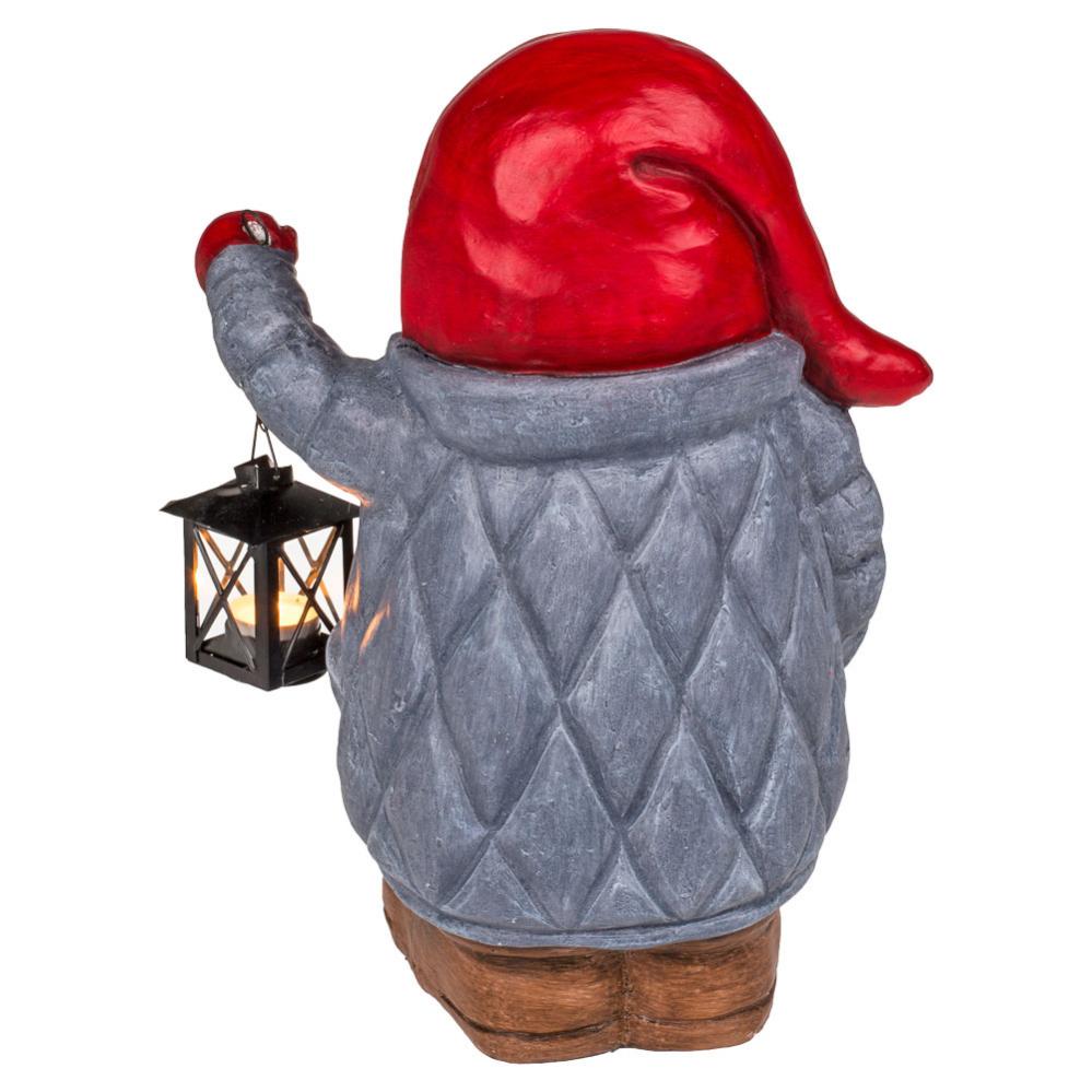 Stor Prydnadstomte med Lykta omfattar en stor och söt målad tomte hållandes en liten lykta. Tomten har röd luva och vante, grå klädsel, bruna skor, en beige utstickande näsa och stort fluffigt skägg i vit polyester. Tomten håller i en svart metallykta som passar för värmeljus. Prydnadstomten är ca 43 cm hög och 30 cm lång.