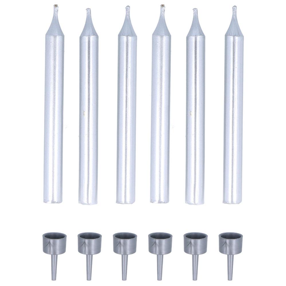 Stora Tårtljus Silver Metallic omfattar en förpackning med 6 st tårtljus i färgen metallic silver. 6 st ljushållare i matt silver medföljer även.