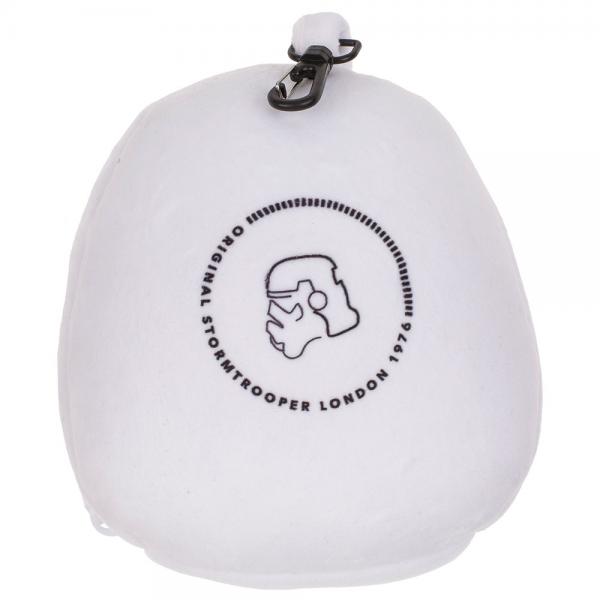 Stormtrooper Plush Resekudde med Ögonmask omfattar en liten resekudde med motiv av en Stormtrooper hjälm från Star Wars. Kudden har ett blixtlås som när det öppnas avslöjar en vit ögonmask med motiv av ett Stormtrooper hjälmvisir. Ögonmasken sitter fast i kudden med resårband och ett spänne och högst upp på kudden finns även en liten hake så kudden lätt kan fästas på t.ex. en ryggsäck.