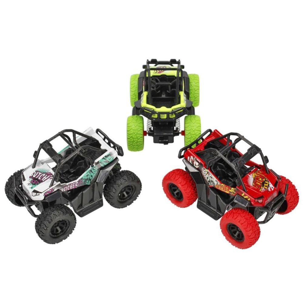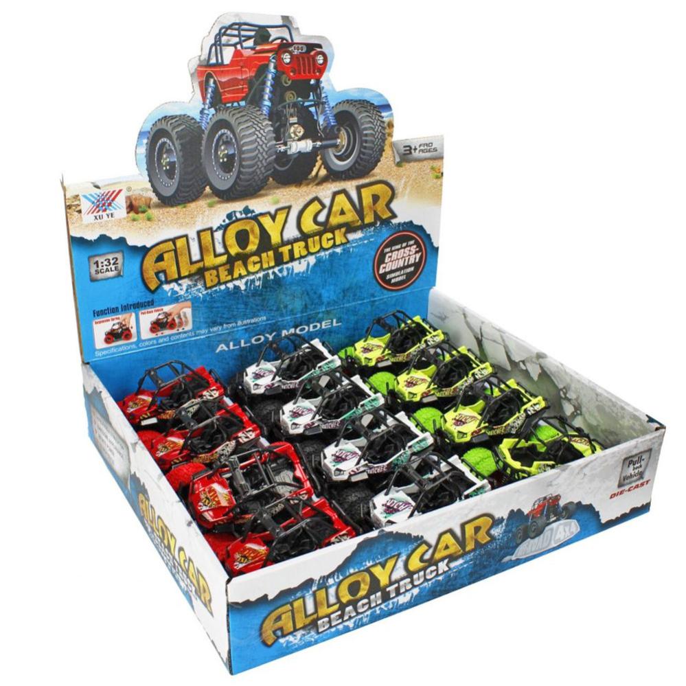 Strandbil Leksak Metall omfattar en billeksak i metall och plast i ett färgglatt mönster i form av en strandbil. Strandbilen har en "pull-back" motor där man kan dra tillbaka bilen, så åker den sedan framåt. Finns i färgerna röd, grön eller vit, vilken du får blir en överraskning.