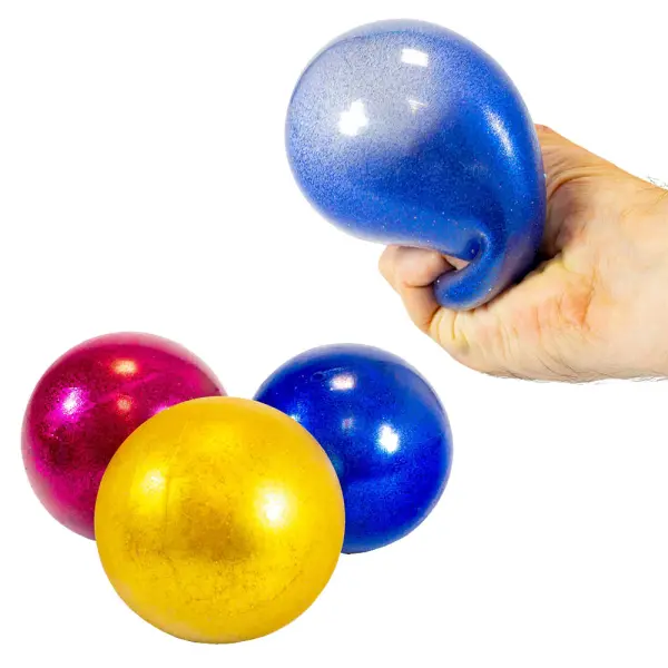 Stressboll Lysande Glitterboll är en stor, lite klibbig och glittrig stressboll som är luftfylld och har en liten boll inuti som blinkar i olika färger vid rörelse.
