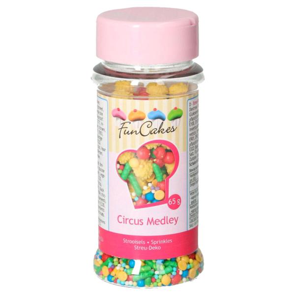 Strössel Circus Medley består av 65 gram strössel på burk i flera olika färger och former.