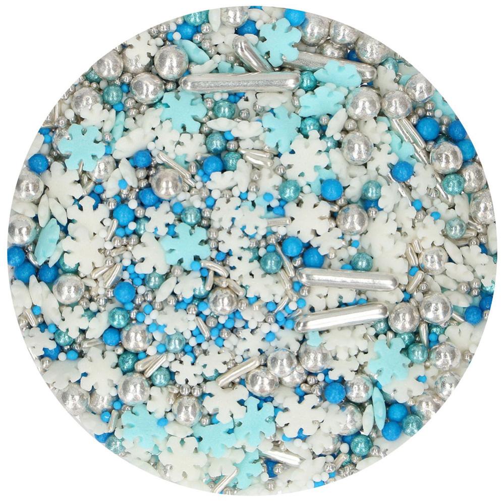 Strösselmix Frosty omfattar 65 gram strösselmix med vitt, blått och silvrigt strössel i form av snöflingor, stavar och pärlor i olika storlekar.