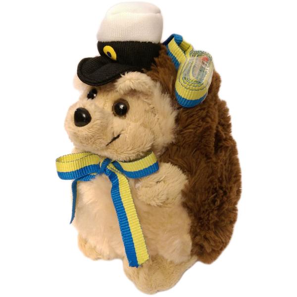 Studentdjur Igelkott omfattar en igelkott i brun/beige design med en studentmössa på huvudet. Studentdjuret kan hängas runt halsen med det medföljande blå/gula nylonbandet.