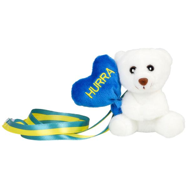 Studentnalle Björn med Hjärta Hurra 11 cm är en studentnalle i form av en vit björn med ett blått hjärta med texten "HURRA" i gult. Ett blågult band med kardborrestängning medföljer för att hängas runt halsen.