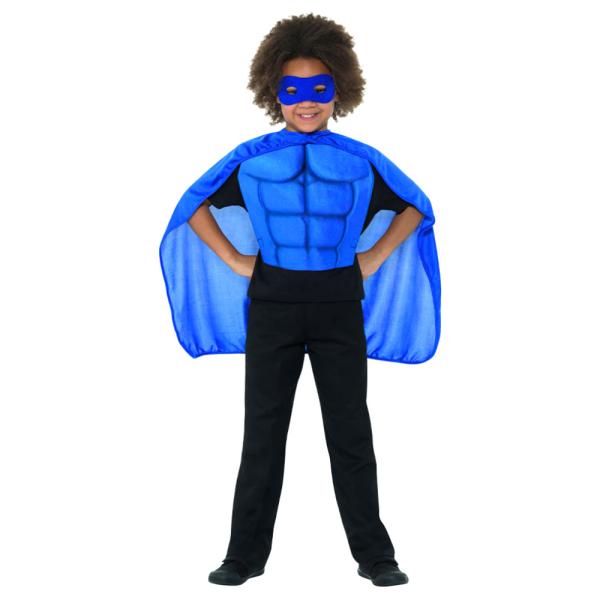 Superhjälte Kit Blå Barn omfattar ett set med delar för en superhjälte dräkt i blått för barn, med cape, mask och ett harnesk med muskler.