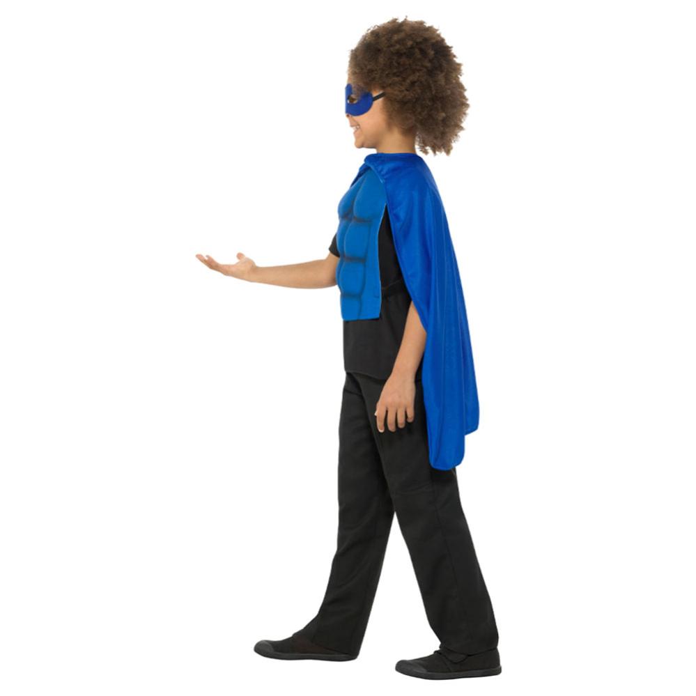 Superhjälte Kit Blå Barn omfattar ett set med delar för en superhjälte dräkt i blått för barn, med cape, mask och ett harnesk med muskler.