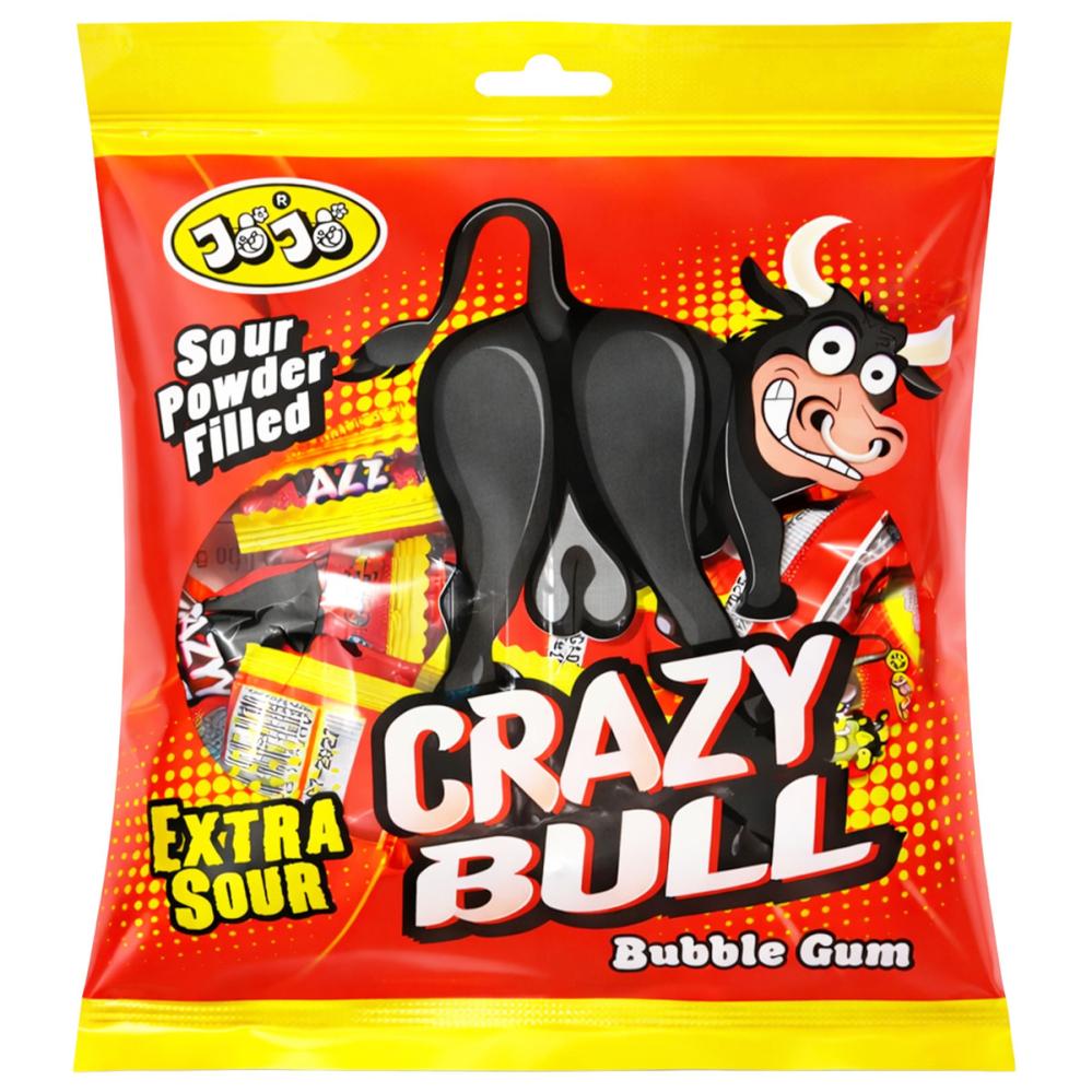 Supersurt Tuggummi Tjur 16-pack 80g är en påse med 80 gram inslagna tuggummin med colasmak, fyllda med surt pulver och med motiv av en tjur.