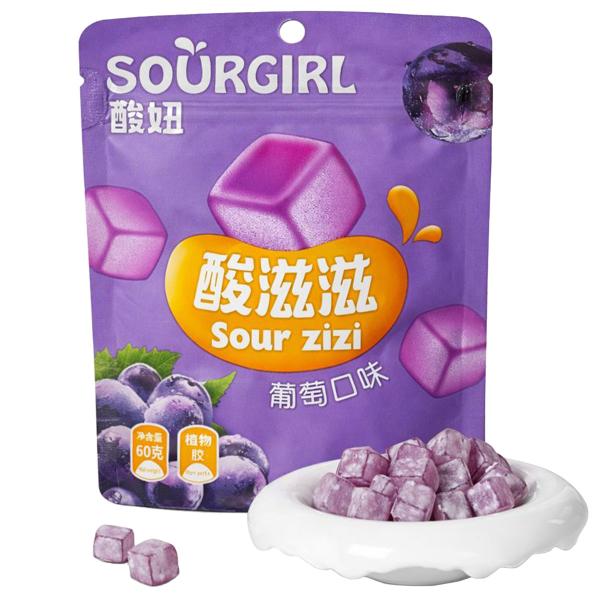 Surt Segt Druvgodis 60g är en påse med 60 gram surt segt godis med druvsmak.