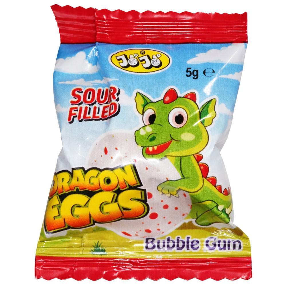 Surt Tuggummi Drakägg 5g är ett inslaget tuggummi med sur fyllning och motiv av ett drakägg.