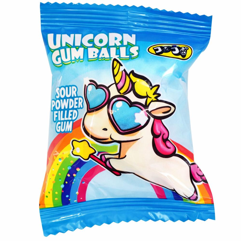 Surt Tuggummi Enhörning 5g är ett inslaget tuggummi med enhörningsmotiv, fyllt med surt pulver.
