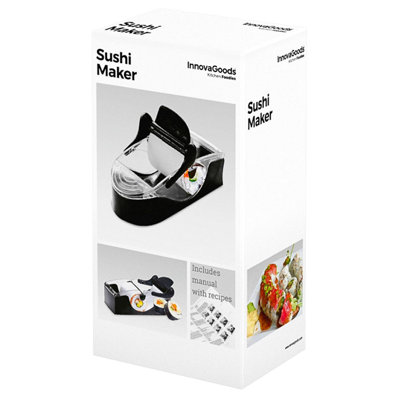Sushi Maker omfattar en sushi maskin som låter dig göra egen sushi i 6 enkla steg. Sushi maskinen är tillverkad av plast och är ca 22 x 8 x 10 cm stor. Medföljer även recept på fyra olika sushi.