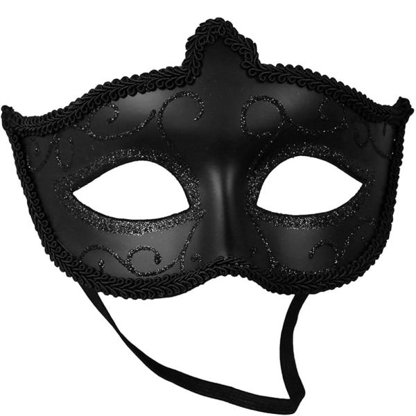 Svart Halvmask med Glitter omfattar en svart halvmask med glitter och ett svart elastiskt band som håller den på plats.