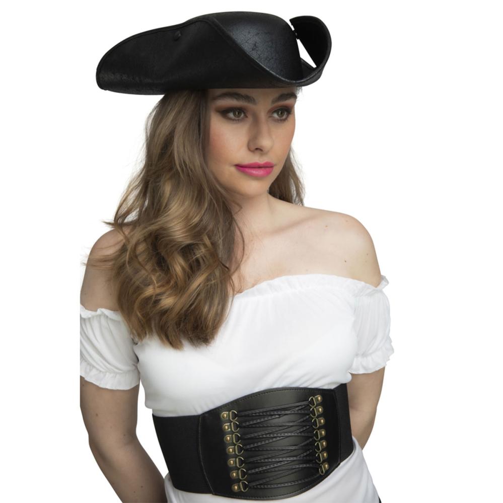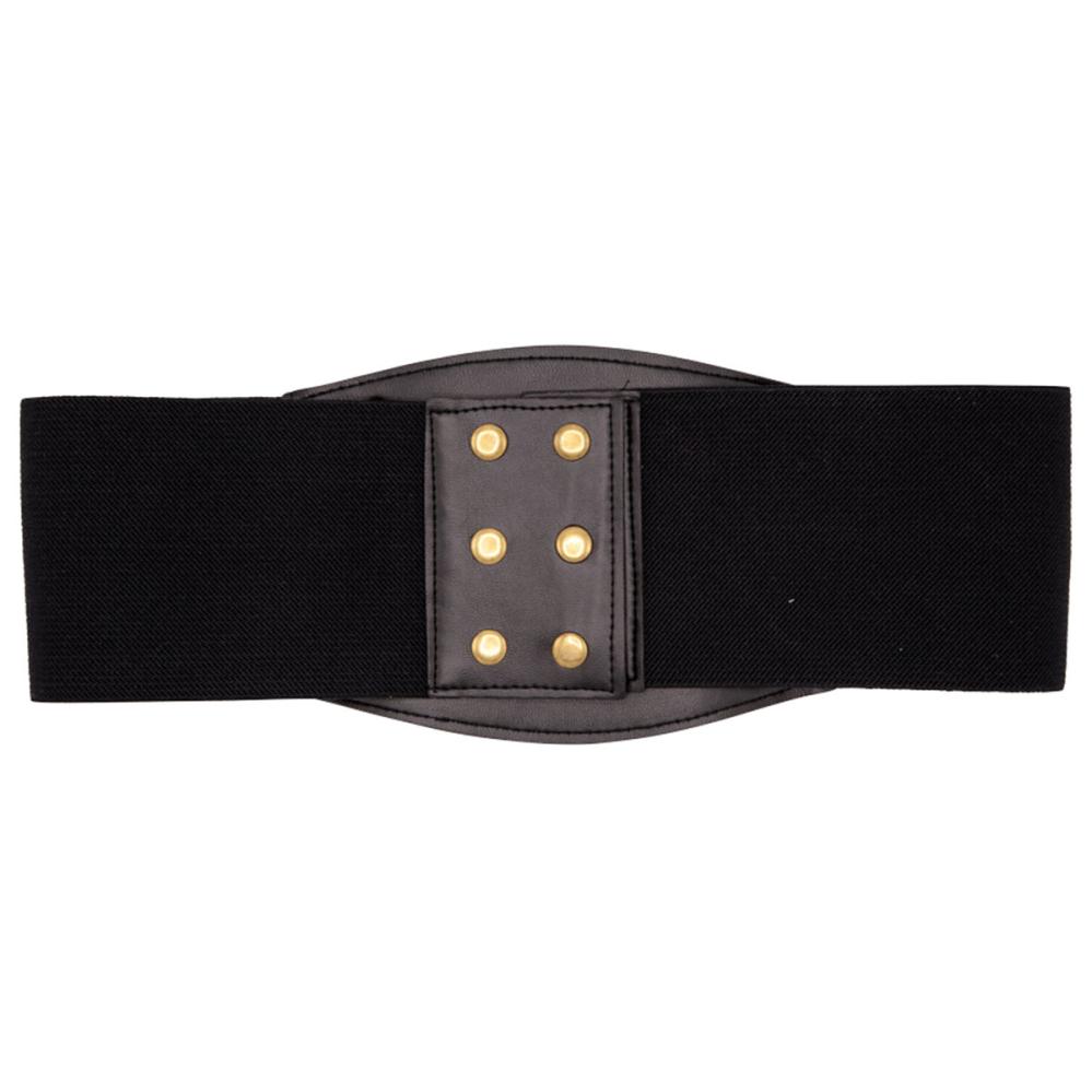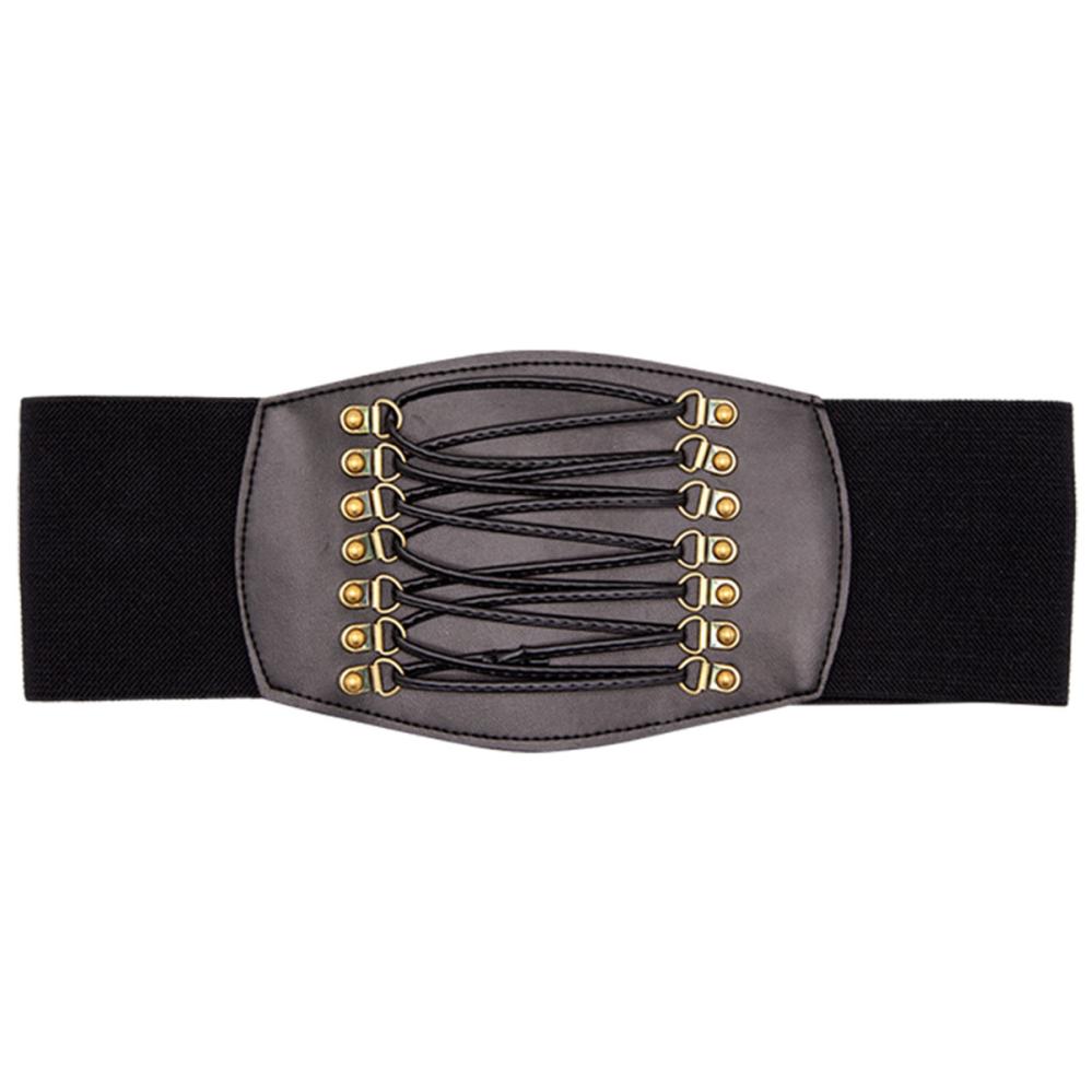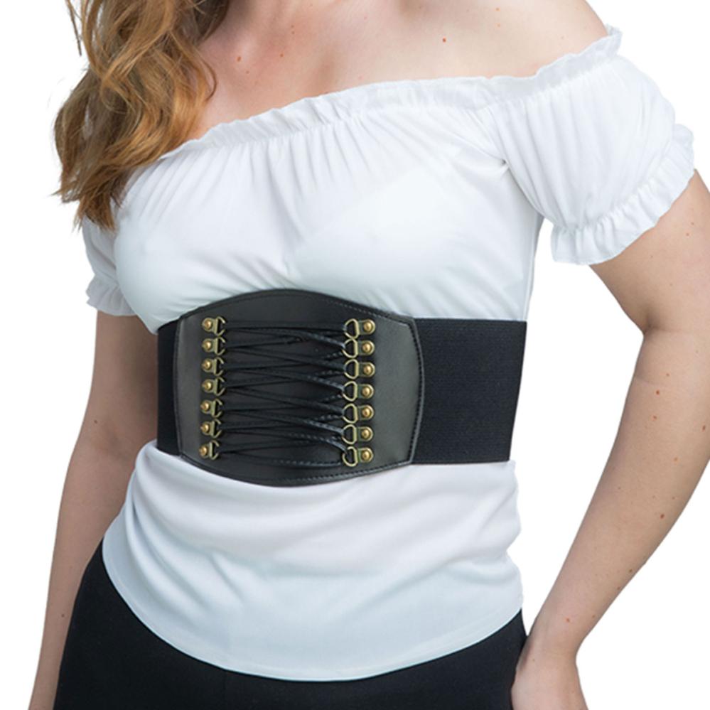 Svart Korsettbälte är ett justerbart korsettbälte med snörning framtill, mässingsfärgade öglor och tryckknappar baktill för enkel stängning.