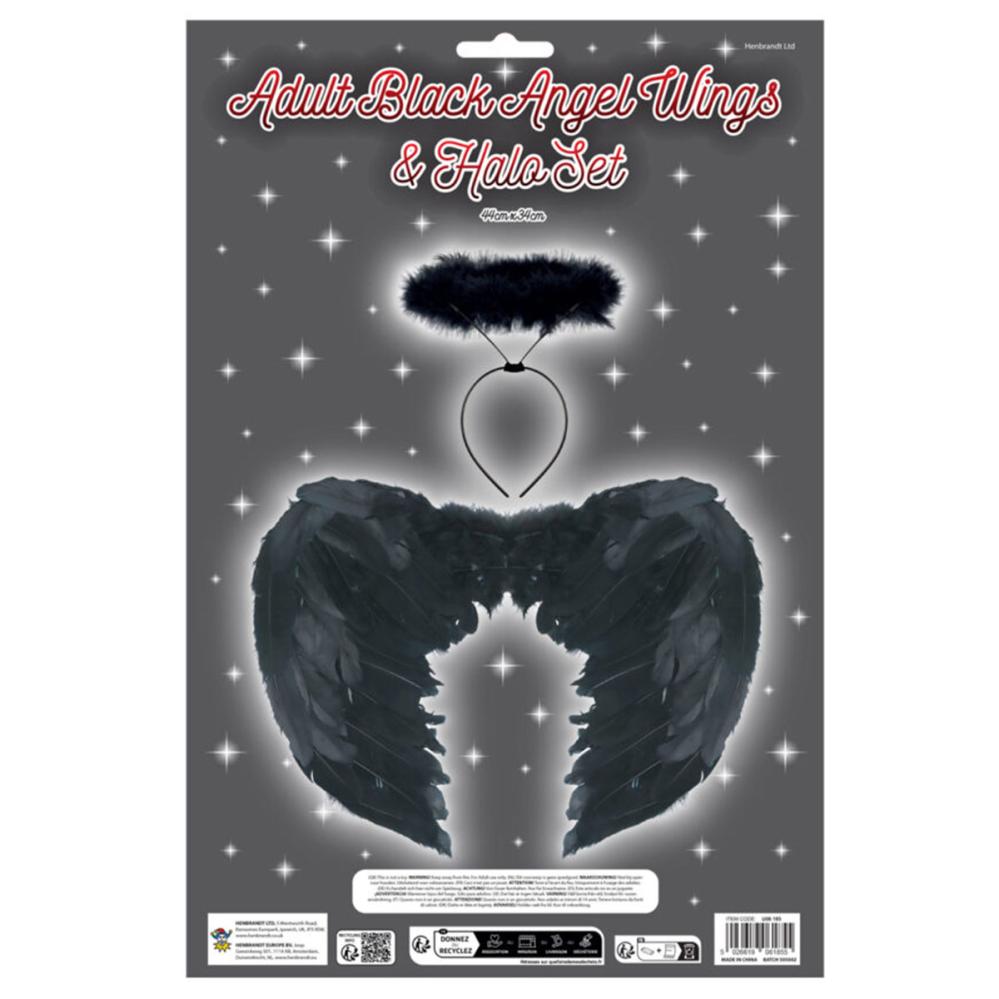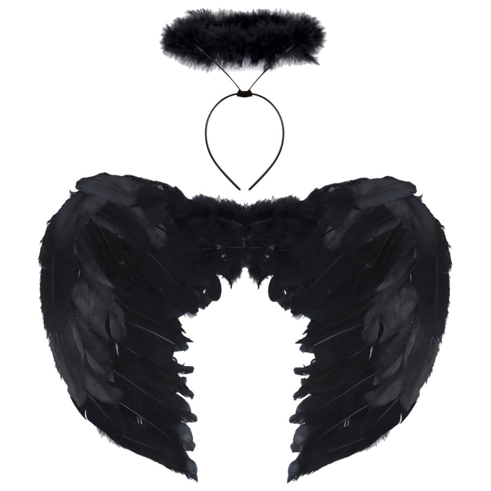 Fullända din Halloweenutklädnad till en ängel med detta kostymset som innehåller svarta änglavingar och en matchande änglagloria. Perfekt för alla som vill glänsa som en mystisk ängel på en maskerad.