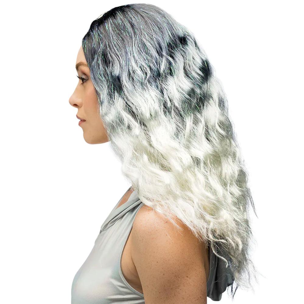 Svartvit Peruk med Glitterstrimmor är en lång och vågig peruk med mittbena och en häftig svartvit design. Peruken har även gröna strimmor som fångar ljuset och ger en extra skimrande effekt.