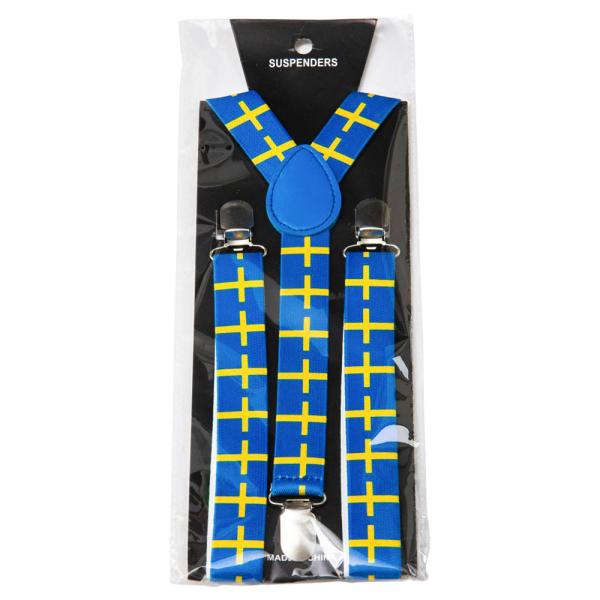 Sverige Hängslen omfattar ett par blåa hängslen av polyester med motiv av svenska flaggor. Hängslena är justerbara och passar vuxna.