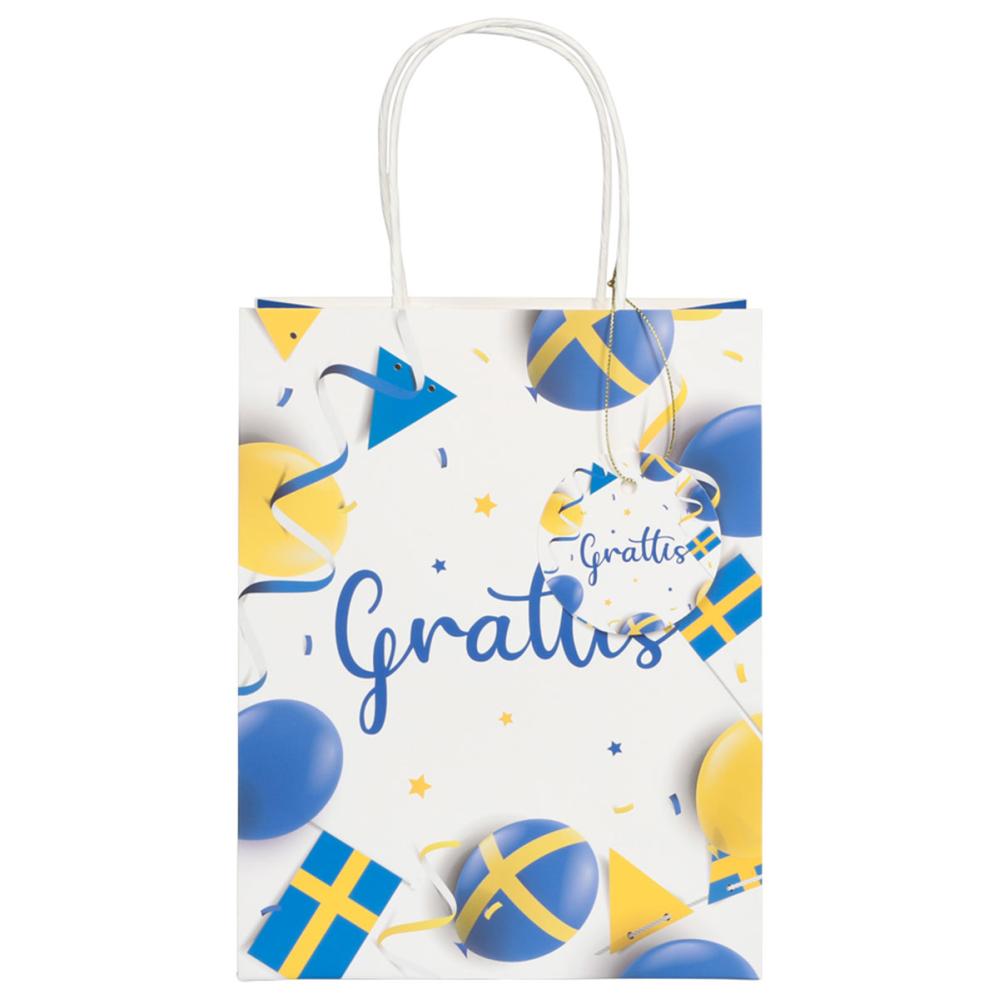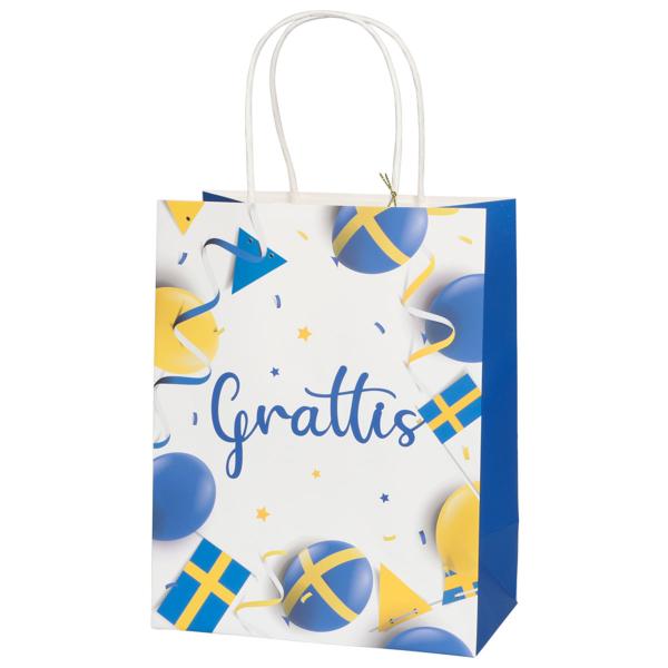 Sveriges Presentpåse Grattis 18 x 10 x 23 cm är en vit presentpåse med texten "Grattis" i blått, omgiven av svenska flaggor, ballonger i blått och gult och vimpelgirlanger i blått och gult. Påsen har blå sidor, vita bärhandtag och en vit rund etikett med ett matchande motiv och ett guldfärgat snöre.