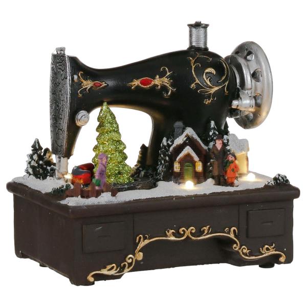 Stämningshöjande julpynt med belysning och en härlig julmelodi för alla jul-hem! Dekorationen föreställer en gammal symaskin med ett vackert vintrigt landskap som får vem som helst att känna den mysiga julkänslan. Med den här fina symaskinen kan du alltså enkelt få till en riktigt fin juldekoration att piffa upp julfirandet med!