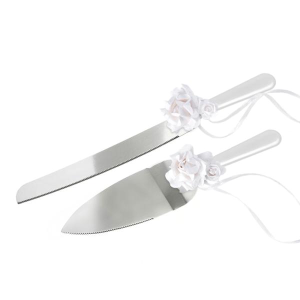 Tårtbestick Set omfattar ett set med en tårtspade och tårtkniv med vita handtag. Tårtspaden är ca 24,5 cm lång och tårtkniven är ca 31 cm lång. Tillverkade av plast och metall.