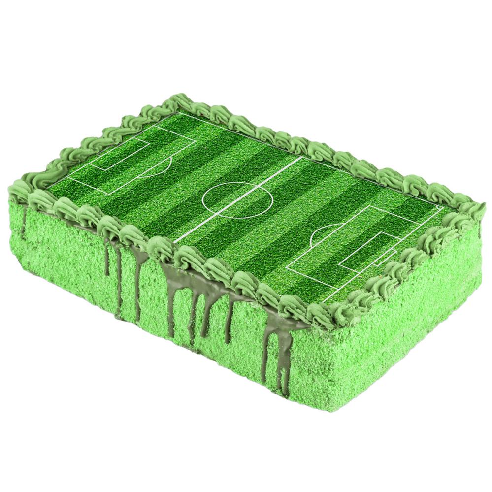 Tårtbild Fotbollsplan Rektangulär omfattar ett ätbart, rektangulärt tårtoblat med motiv av en klassisk fotbollsplan. Ta av skyddet på baksidan och applicera sedan direkt på tårtan.