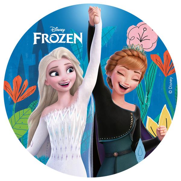 Tårtbild Frost Rund omfattar ett ätbart rund tårtoblat ark med motiv av Elsa och Anna från Disneys Frozen att dekorera en tårta med. Ta av skyddet på baksidan och applicera sedan direkt på tårtan.