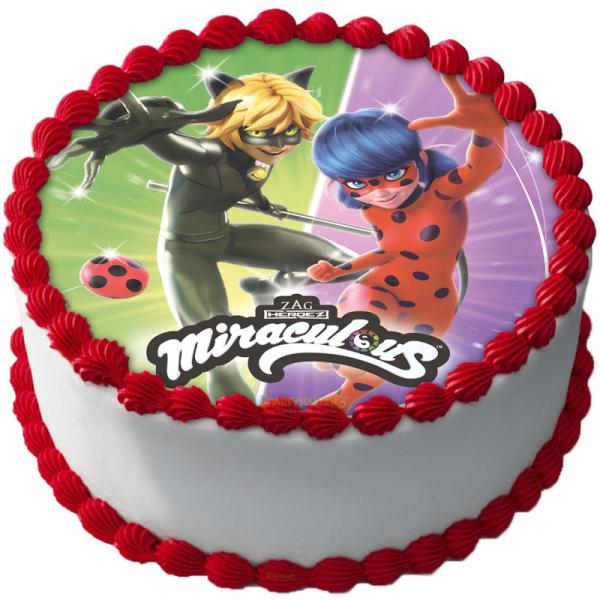 - Tårtoblat med bild av the Miraculous Ladybug och Cat Noir.