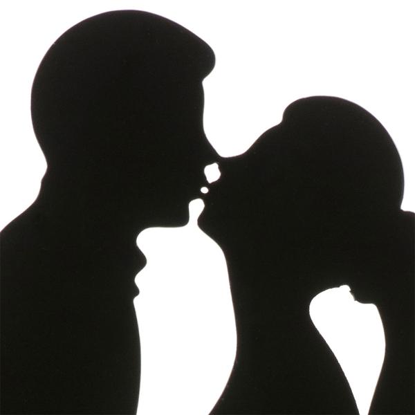 Tårtdekoration Brudpar Silhuett Kyss omfattar en bröllopsfigur i form av en silhuett av ett brudpar som kysser. Figuren är platt och kommer på en oval bas och kommer med en genomskinlig skyddsplatta i plast.