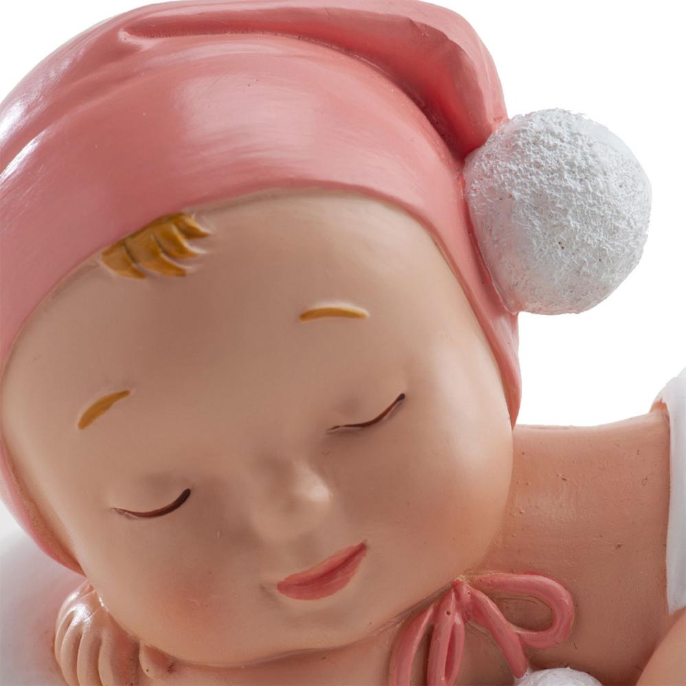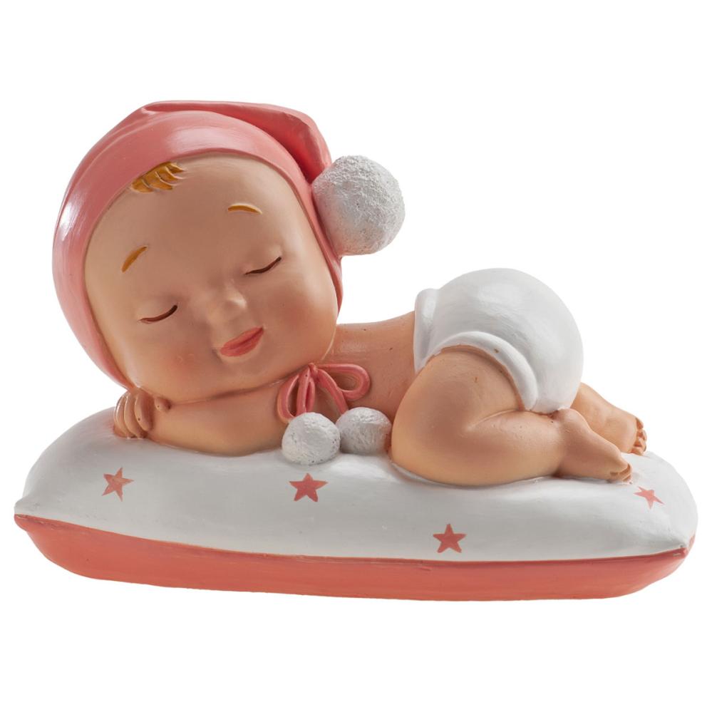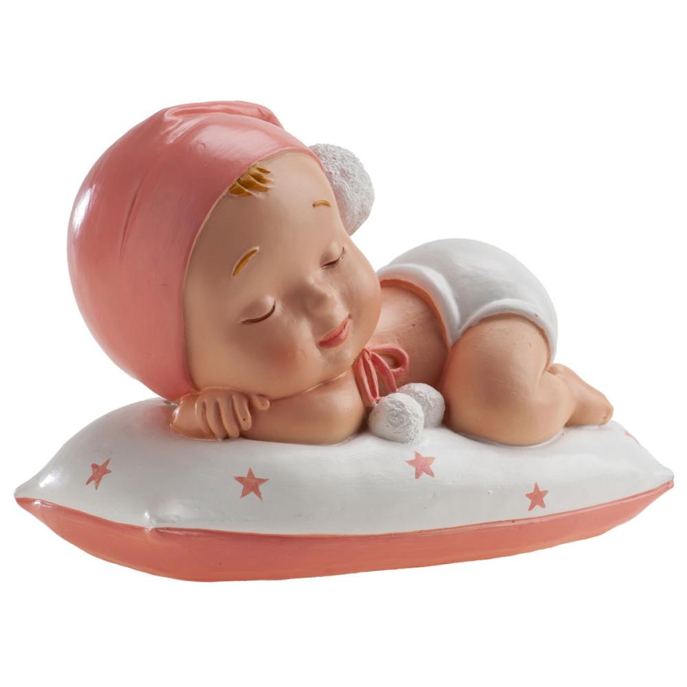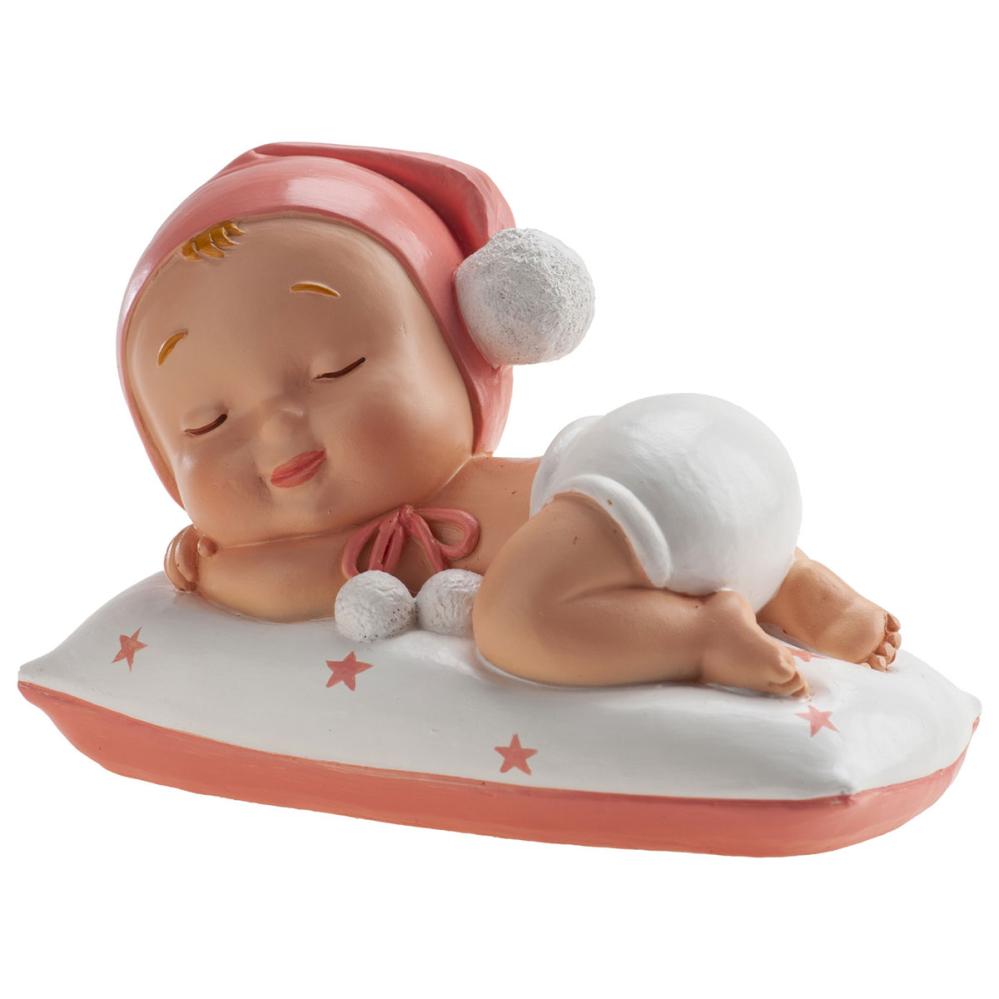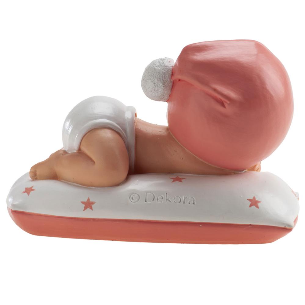 Tårtdekoration Dopfigur Sovande Flicka omfattar en söt tårtdekoration med rosa detaljer, föreställande en sovande liten flicka med en PomPom. Denna charmiga dekoration är perfekt för dop, namngivningsceremonier eller andra speciella högtider.