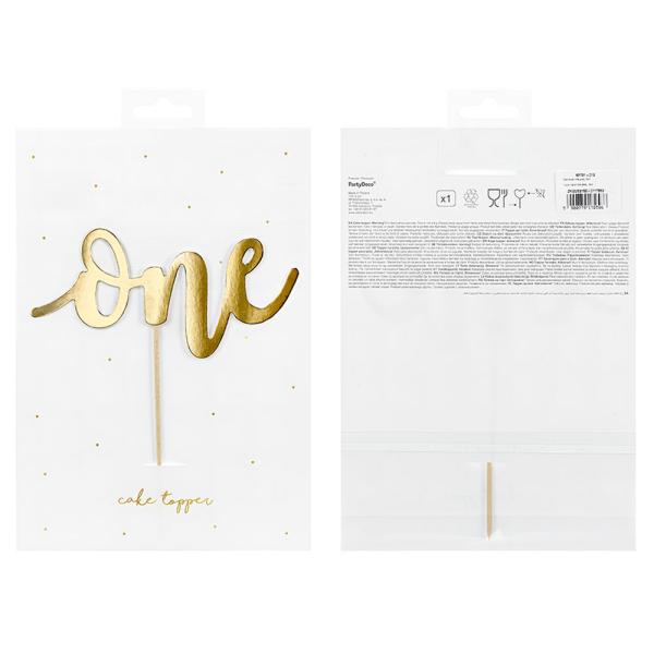 Tårtdekoration One Guld omfattar en tårtdekoration i guldig papp fäst på en träpinne med texten "One" i snirkliga bokstäver. Dekorationen är ca 19 cm hög och 16 cm bred.