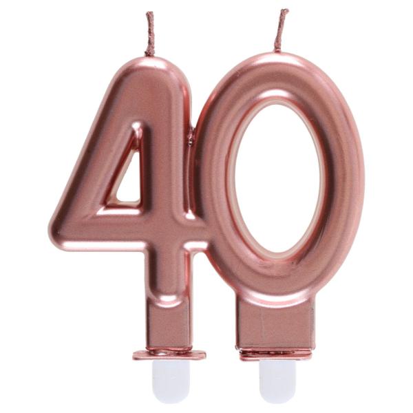 Tårtljus 40 Roseguld omfattar ett roseguldigt tårtljus i form av siffran 40. Tårtljuset är ca 8 cm högt och 7,5 cm brett, och är försett med små plastpinnar som enkelt håller det på plats på tårtan.