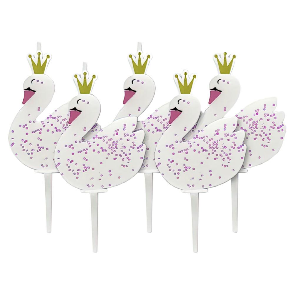 Tårtljus Glitter Swan omfattar 5 st tårtljus i form av vita svanar med rosa glitter. Ljusen är ca 6,7 cm långa och är försedda med plastpinnar som gör de enkla att sticka ner i tårtan.